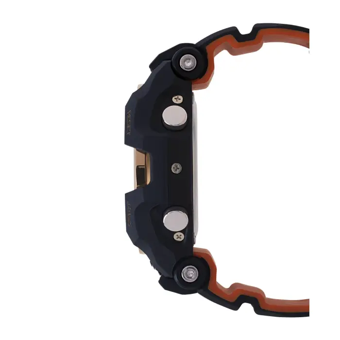 The Casio G-Shock Gravitymaster GR-B100-1A4 is a high-performance aviation timepiece designed for pilots and aviation enthusiasts. Part of the Gravitymaster series, this model features a bold black and orange color scheme with a distinctive two-tone layered resin band.Ā This watch is powered by Casio's Tough Solar technology, ensuring reliable operation without the need for battery replacements. It also features Bluetooth Smartphone Link for automatic time adjustment, flight log recording, and easy watch setting via the G-SHOCK Connected app. The large case measures 53.8mm in diameter and is built with a shock-resistant resin and stainless steel structure.Ā The watch features a large, high-resolution STN LCD display inspired by the glass cockpit of modern aircraft, providing clear visibility of flight data. Key functions include a flight log memory, world time (39 cities), a 1/1000-second stopwatch, countdown timer, and 5 multi-function alarms. It is protected by Mineral Glass and illuminated by a double LED light (Super Illuminator). With a water resistance rating of 200 meters (20 Bar), it is built to withstand the rigors of flight and outdoor activities.