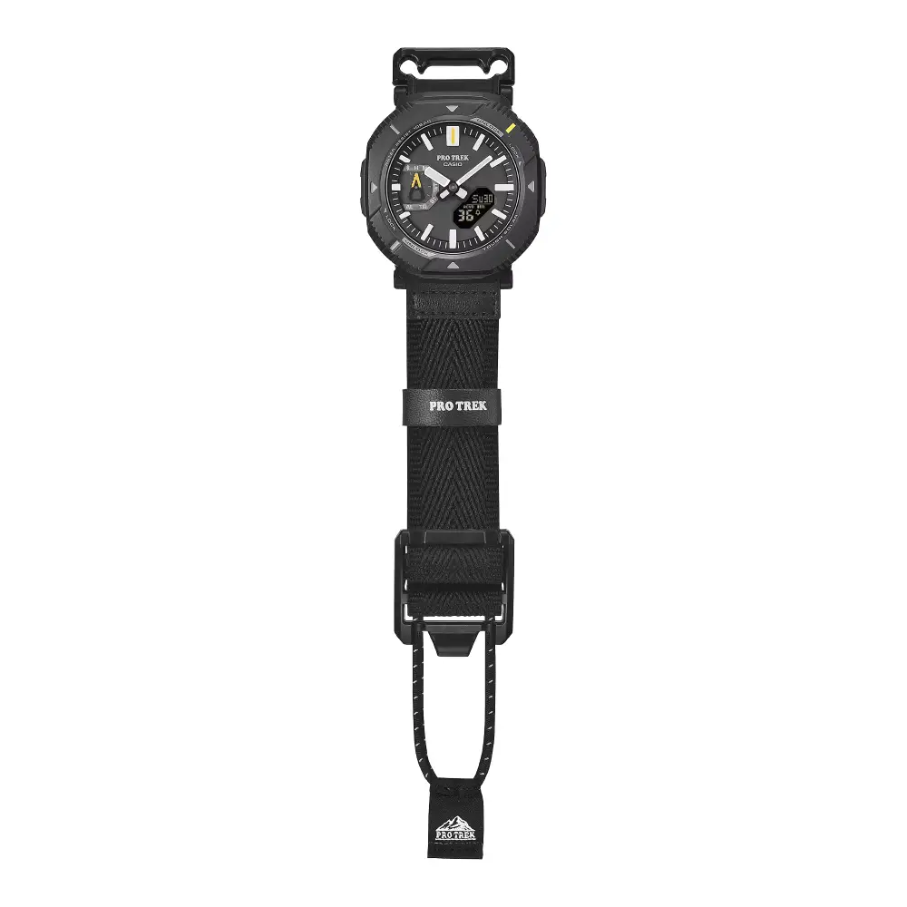 The Casio ProTrek Analog-Digital PRJ-B001B-1D is a revolutionary outdoor timepiece designed for the lightest, most comfortable trekking experience. This model introduces the innovative Rotary Guard Bezel, which allows you to switch between a stylish angular design that covers buttons and a rounded mode that uncovers them for easy access during activity.Ā This watch is powered by Tough Solar technology, ensuring reliable operation without battery changes, and features Bluetooth Smartphone Link for automatic time adjustment and trek logging. The case measures a compact 46mm in diameter and is constructed from eco-friendly Bio-based Resin.Ā The dial is a hybrid Analog-Digital display (black with positive LCD) featuring high-visibility hands and a unique carabiner-inspired inset dial. A standout feature is the Bungee Cord Cloth Band, inspired by outdoor gear, which offers a breathable fit and can be easily fastened over heavy outerwear. With a water resistance rating of 100 meters (10 Bar) and low-temperature resistance (-10ā), the PRJ-B001B-1D is the ultimate companion for ultralight hiking and long trails.