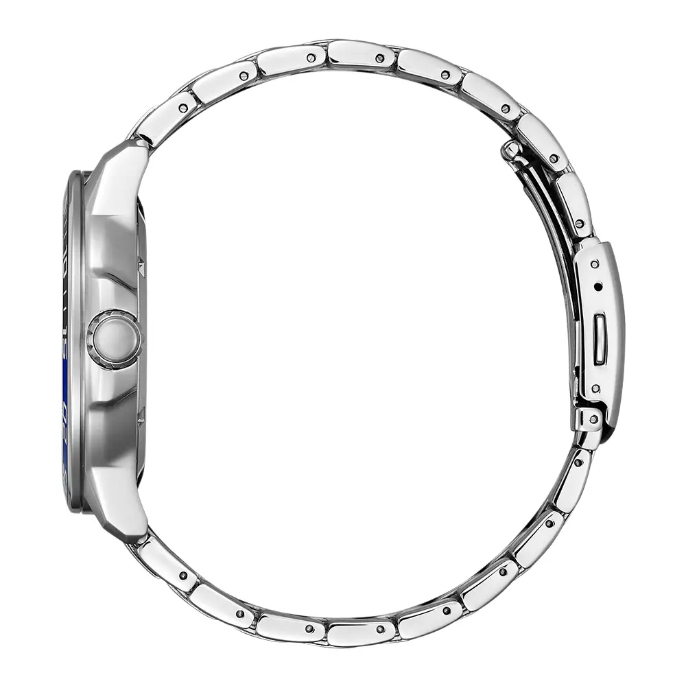 The Citizen Eco-Drive Analog AW1525-81L is a practical and robust men's timepiece that offers dependable, maintenance-free timekeeping in a bold, sporty design. This watch is powered by Citizen's reliable Eco-Drive technology (Caliber J810), which continuously converts any light source into energy for the quartz movement, eliminating the need for battery replacements. The timepiece features a captivating Blue Dial with prominent luminous hands and markers for enhanced visibility. The large stainless steel case measures 44.5mm in diameter and has a slim 10.8mm thickness. The dial is protected by a scratch-resistant Mineral Glass. Practical features include a Date display at the 3 o'clock position. It is completed by a robust stainless steel bracelet with a triple-fold clasp and offers a water resistance rating of 100 meters (10 Bar), making it suitable for swimming and active wear.