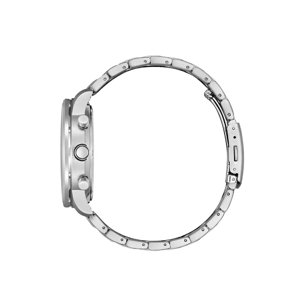 The Citizen Eco-Drive Chronograph CA4500-91A is a sophisticated and robust men's timepiece, recognized by enthusiasts as a classic "Panda Style" chronograph due to its high-contrast white dial and dark sub-dials. This watch is a perfect accessible pilot timepiece, blending an aviation-inspired design with sustainable technology.Ā This watch is powered by Citizen's innovative Eco-Drive technology (Caliber B620), utilizing a reliable solar-charged quartz movement that harnesses energy from any light source, ensuring continuous operation with a 9-month power reserve on a full charge. The timepiece features a crisp white dial with three functional sub-dials for chronograph measurement and a 24-hour display. The large stainless steel case measures a bold 44mm in diameter and is protected by a durable Mineral Crystal. The CA4500-91A is completed by a robust stainless steel bracelet and offers a water resistance rating of 100 meters (10 Bar), making it ideal for swimming and active wear.