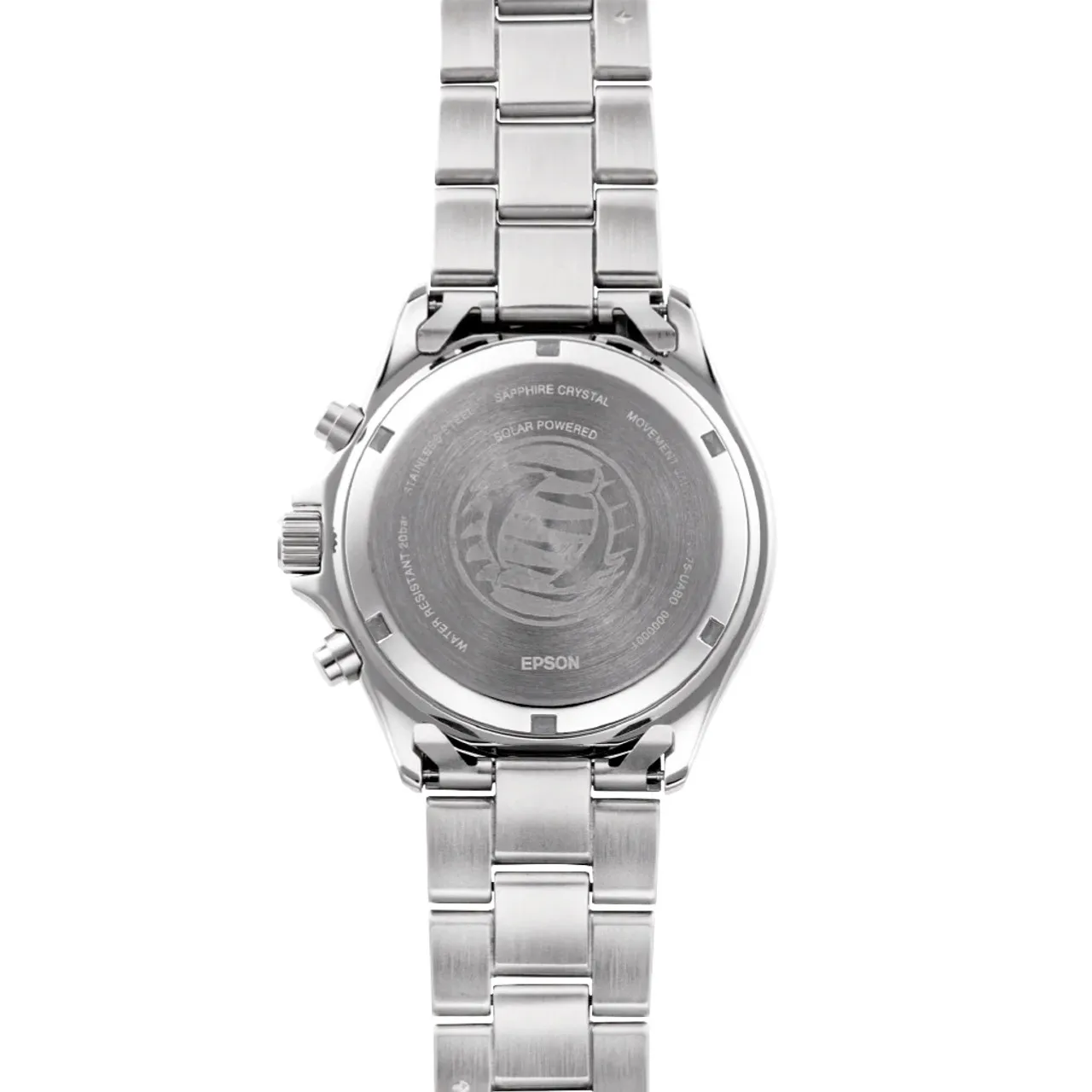 The Orient Mako Solar Chronograph RA-TX0201L10B is a robust men's timepiece that seamlessly blends eco-conscious technology with classic dive watch aesthetics. Powered by solar energy, this watch eliminates the need for battery replacements, offering a sustainable and hassle-free experience. Its striking blue dial, complemented by a stainless steel case and bracelet, exudes a sporty elegance suitable for both underwater adventures and everyday wear. With a water resistance of 200 meters and a durable sapphire crystal, this chronograph is built to withstand the rigors of active lifestyles