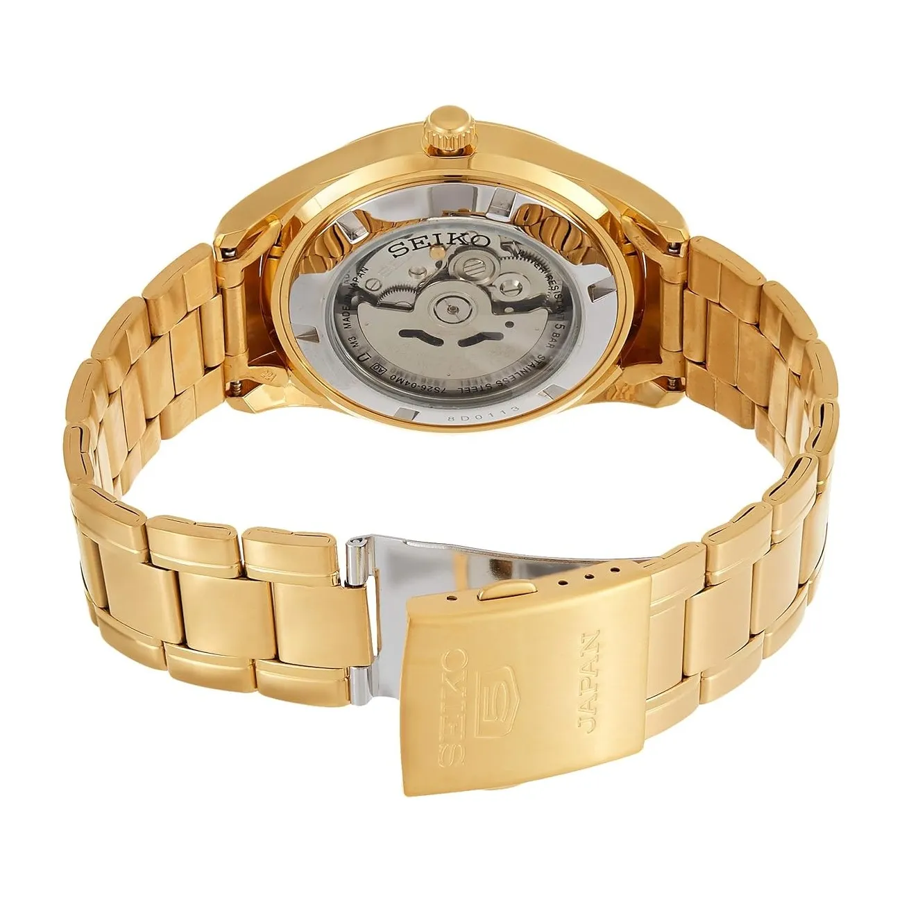 The SNKN96J1 features a radiant gold sunburst dial that immediately draws attention, framed by a polished stainless steel case measuring 43.5mm in diameter. Gold-tone hands and indices create a warm contrast, offering a luxurious feel without being overstated. The watch is powered by Seiko’s reliable 7S26 automatic movement, with a day-date complication neatly positioned at 3 o'clock for everyday practicality.