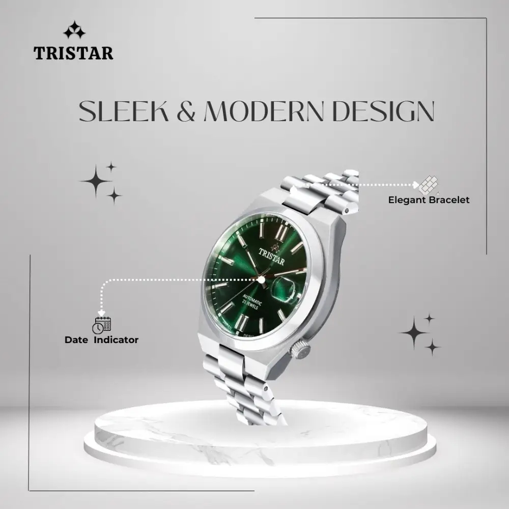 The Tristar Basic Index Green Dial Stainless Steel Men’s Watch combines timeless appeal with modern precision, offering a sophisticated accessory that suits any lifestyle. With a 40mm case and a mechanical self-winding movement, this men’s automatic watch ensures effortless and reliable timekeeping day after day. Its sleek black dial is complemented by a distinctive stainless steel bracelet, adding both durability and refined style to your wrist. Designed to go beyond the ordinary, Tristar pairs this watch with scratch-resistant sapphire crystal glass, ensuring lasting luxury and resilience. This timepiece is a perfect expression of classic design elevated by contemporary craftsmanship.